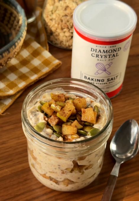 Combine oats, milk, yogurt, chia seeds, maple syrup, vanilla, baking salt and remaining cinnamon in a large bowl.