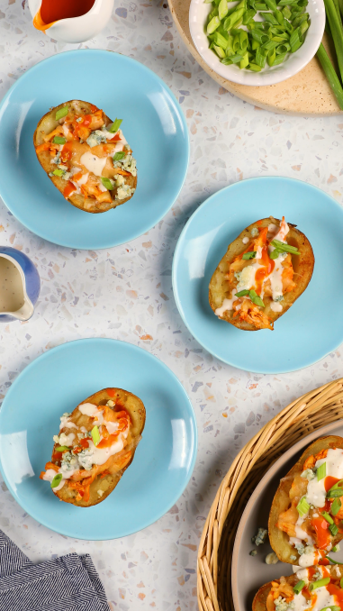 Fill each potato skin evenly with the buffalo chicken, then top with shredded Monterey Jack cheese.