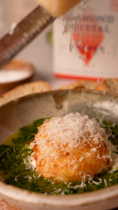Spread green herb sauce onto serving plate and top with fried burrata ball. Garnish with additional parsley and kosher salt. Serve with baguette crostini.