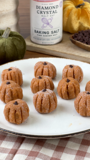 Once chilled, scoop mixture into about 25 tablespoon-sized portions. Lightly spray hands with cooking spray to prevent sticking and roll each portion into a small smooth ball. Roll each ball in granulated sugar to coat. Using a toothpick or skewer, create vertical ridges in each truffle from top to bottom, to resemble a pumpkin. Top each pumpkin truffle with a chocolate chip to resemble the stem and place onto a clean parchment-lined baking sheet. Return to refrigerator until ready to serve.