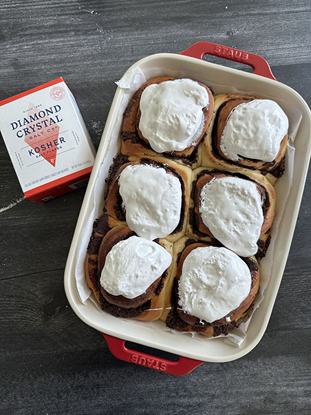 Soft cinnamon-roll-style buns filled with salted milk + dark chocolate, topped with toasted marshmallow fluff.