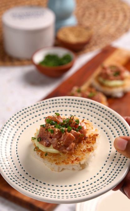 Lightly wet your hands and shape rice into small rectangles or rounds, about 2-3 inches wide and ½-inch thick. Refrigerate rice cakes for at least 20 minutes.