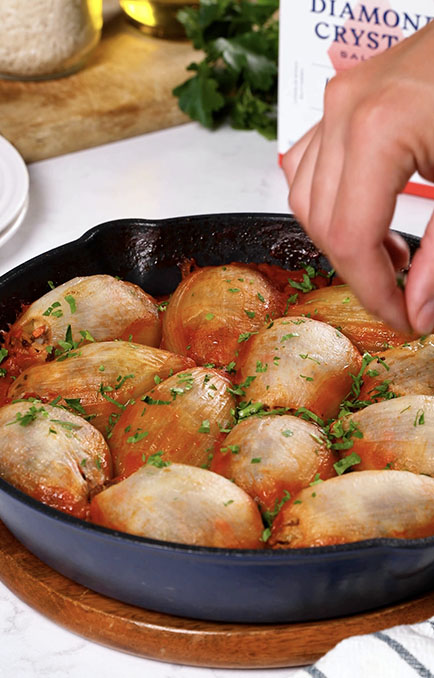 Stuff each onion layer with about 2 tablespoons of beef and rice mixture. Roll onions around filling, overlapping cut edges to seal. Place stuffed onions seam-side-down into skillet, nestling into tomato sauce. Pour broth evenly over stuffed onions in skillet. Cover and bring to simmer over low heat. Cook until rice is tender and almost all of the broth is absorbed, about 40-50 minutes. Garnish with additional parsley and serve.